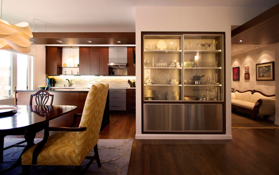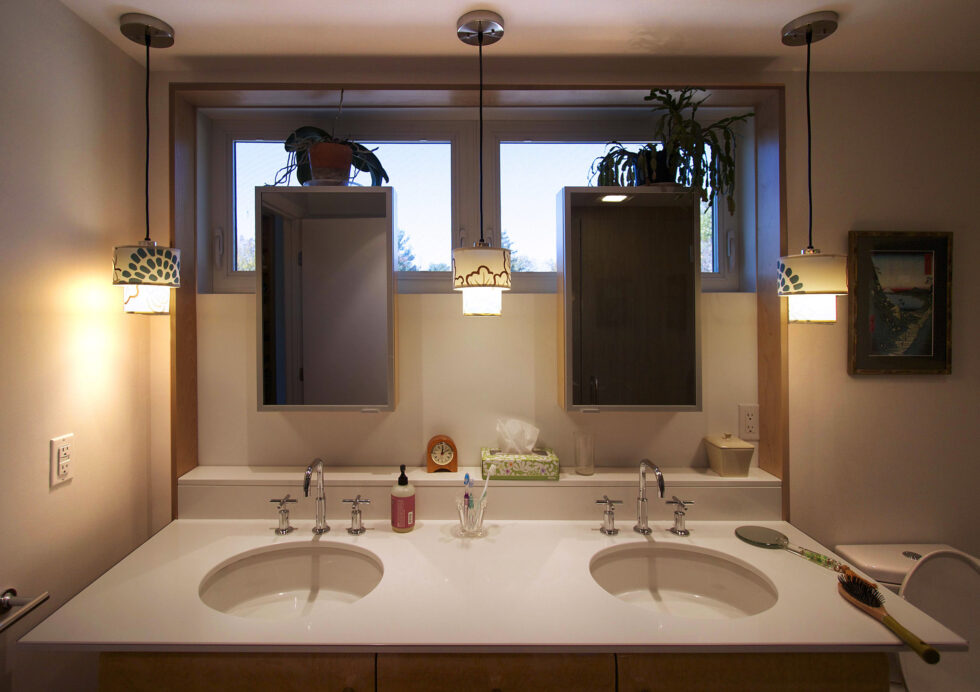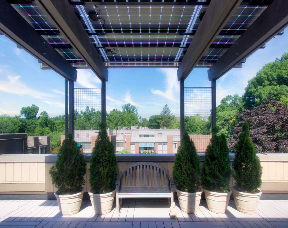 This remodel of a 2100SF fourth floor penthouse in West Hartford took it from 70’s kitsch to thoroughly modern. Along the way we made major improvements that cut energy use in half while transforming the experience of comfort. To produce energy a solar canopy was designed for the east and west patios. These architectural additions not only produce 87% of all the energy they use, they provide welcome shade and shelter. These otherwise hot patios have become outdoor “rooms” with welcome shade in the style of a pergola with translucent glass solar panels for a roof.