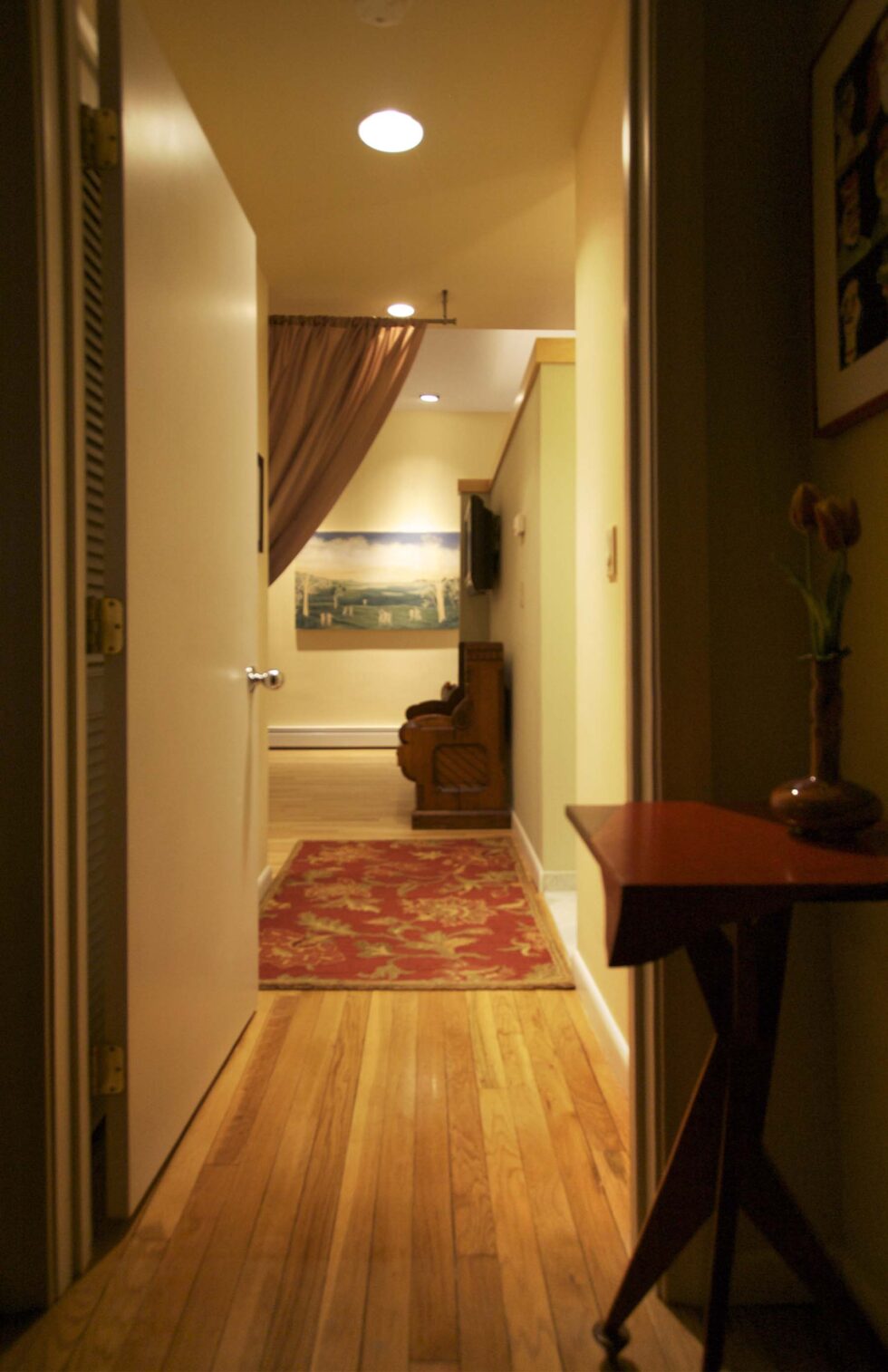 This had been one large open space with a high ceiling. In subdividing it we only brought the new walls part way up, enough to define the spaces from each other, but at the same time allowing the ceiling to be shared.