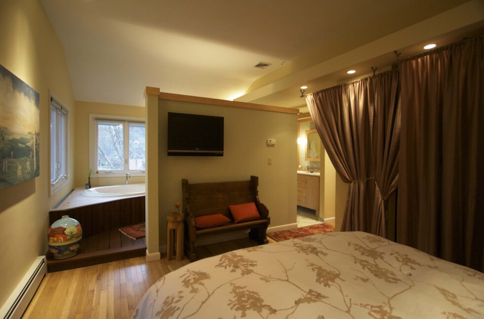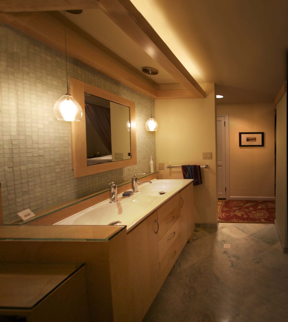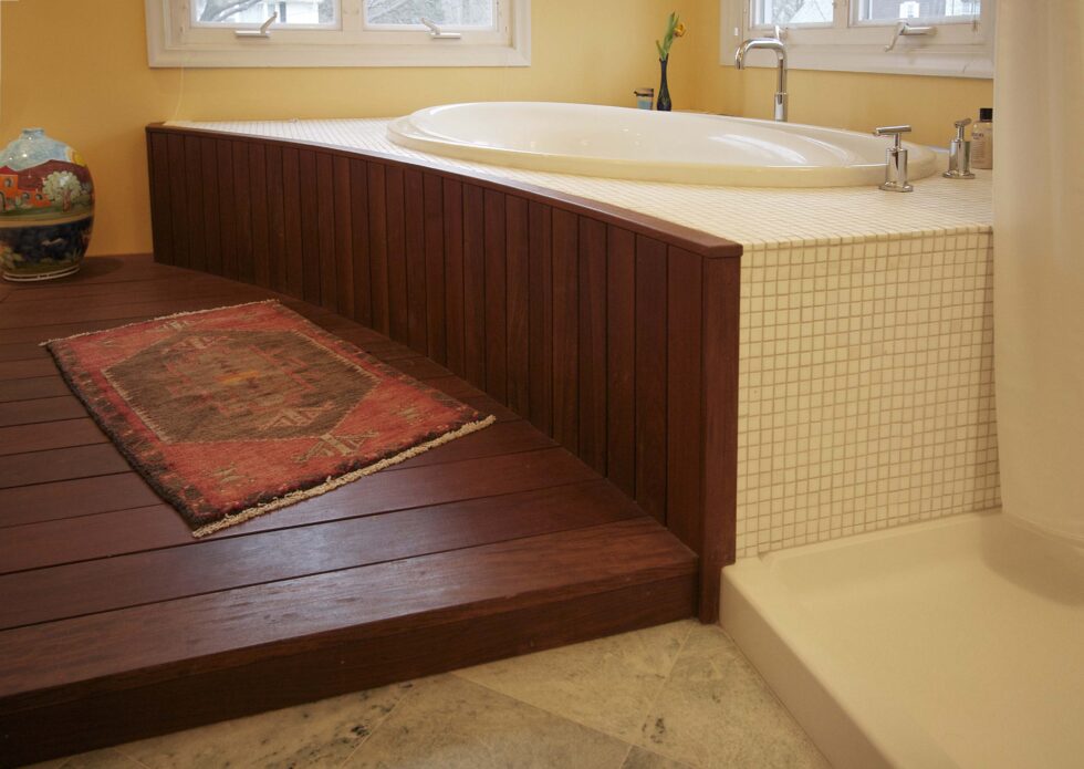 Rather than separate bath functions by doors, the tub, the show, and the bathroom area all open into each other. Features like the wood deck by the tub and the floating soffit above the vanity are used to make each of these areas distinct from one another.