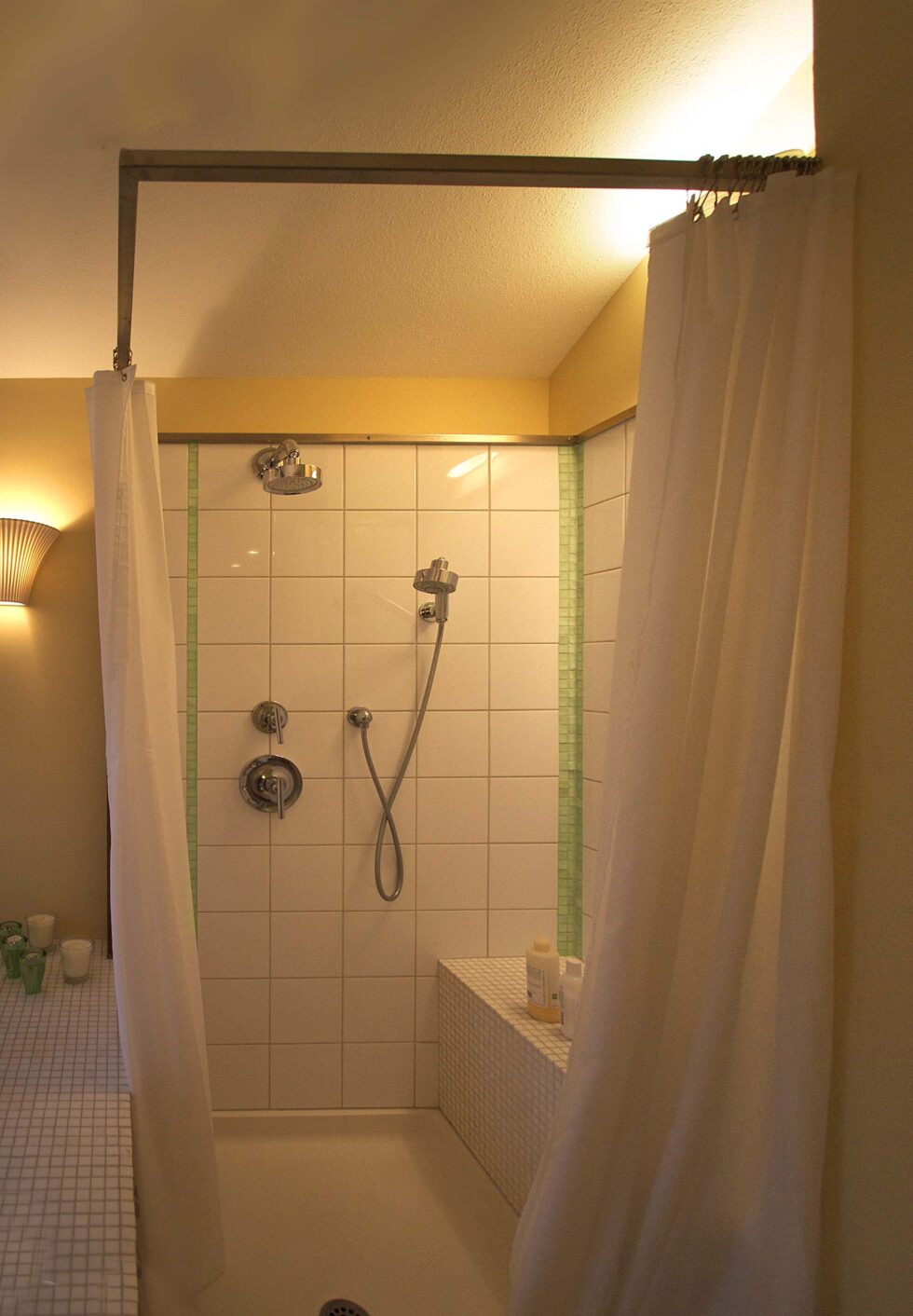 Inspired by a visit to a Miami South Beach boutique hotel with flowing curtains and colorful spaces the curtains here are used to signal and recall the sensation of a memorable anniversary vacation. Rather than doors to the closets, these sweeping curtains recreate that sensuous quality.