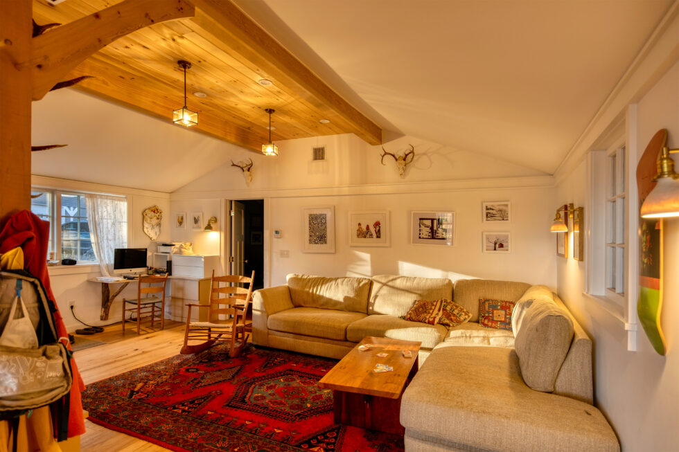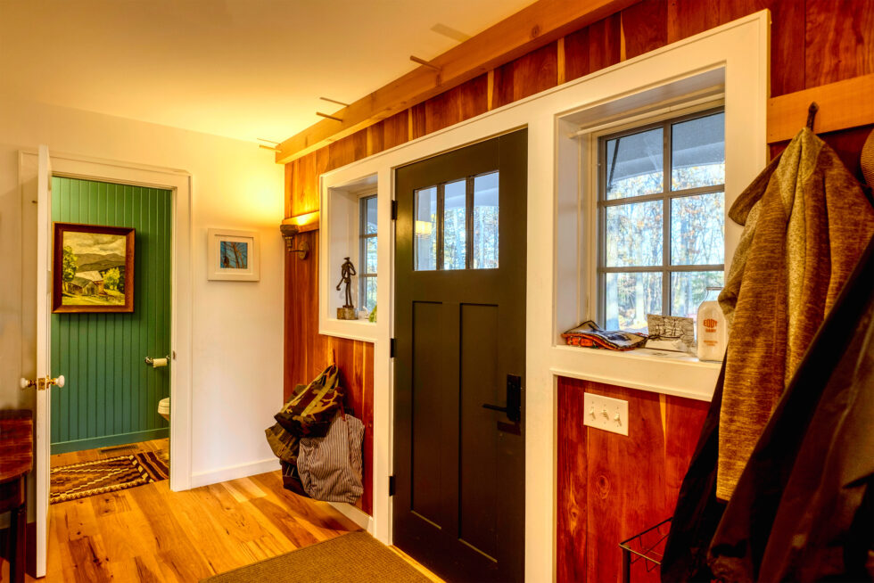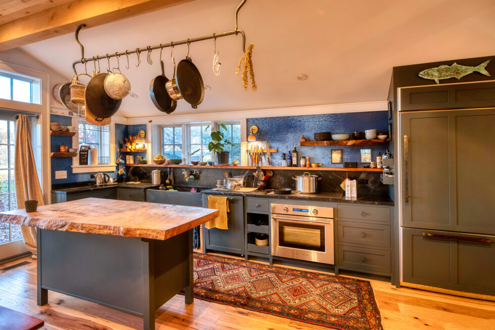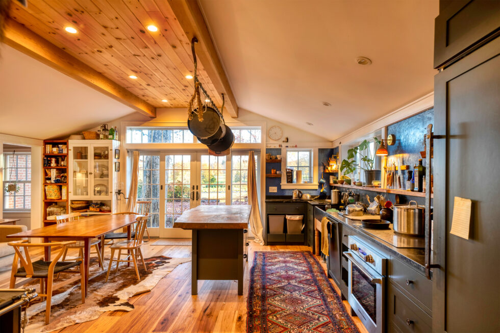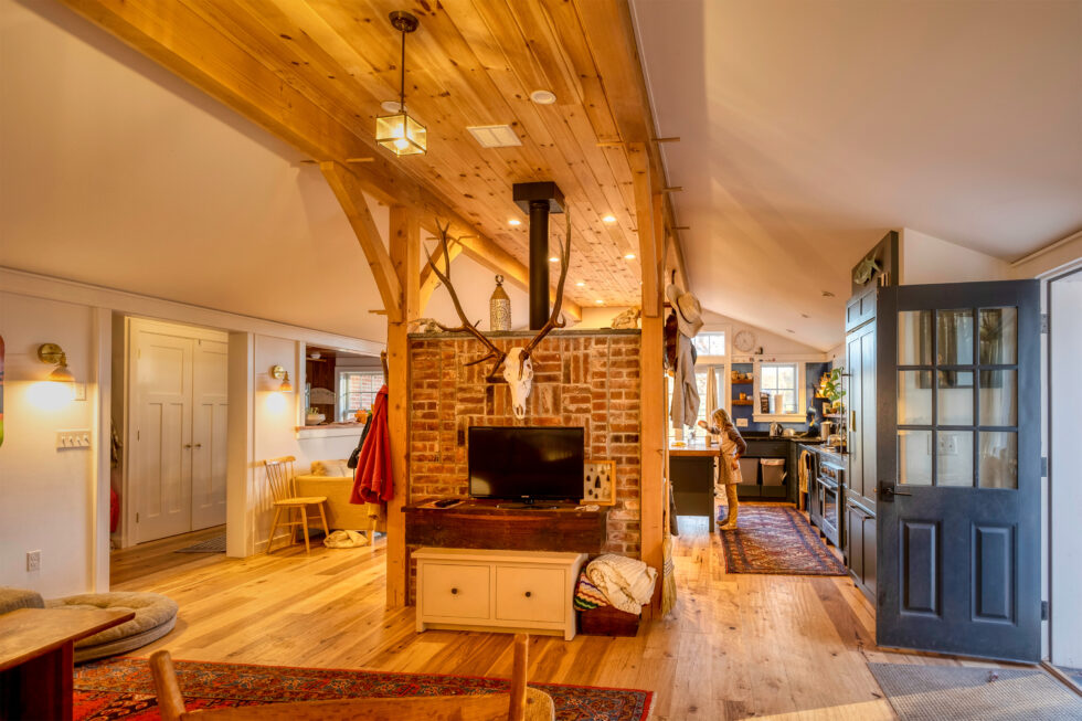 We remodeled this home for the family of this third generation family farm. Originally built in phases over many years, the house was a jumble. It needed help. It was also drafty and wet. After fully insulating and air sealing it is now consistently comfortable. We added a small but essential entry area that connected all the disjointed parts of the house and opened an area to become an extended kitchen, dining, and gathering space featuring a post and beam frame and an actively used wood cookstove. The walls above the kitchen counter were once the painted plywood floor of the old kitchen area. Every inch of this renovated home is delightfully well lived in.